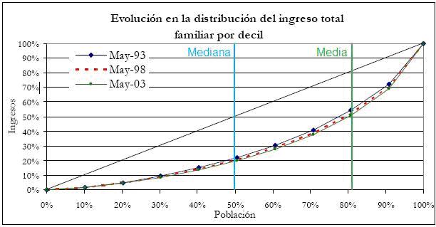 Distribución del ingreso en Argentina - La distribución del ingreso puede ser analizada a través de la curva de Lorenz la cual representa la distribución acumulada de los ingresos de hogares. La curva de Lorenz permite ver gráficamente la distribución de los ingresos entre los hogares. En el gráfico se miden en el eje de las abscisas (Población) los hogares ordenados según los ingresos que perciben (de menor a mayor) y en el eje de las ordenadas (Ingresos) la proporción de ingreso que acumulan estos hogares. Cuando la distribución es perfectamente equitativa, a cada porcentaje de hogar le corresponde el mismo porcentaje de ingresos, o sea el 10% de los hogares se apropia del 10% de los ingresos, el 20% de ellos del 20% de ingresos y así para cada decil. Esta situación está representada en el gráfico por la línea de 45° (línea recta). En la Argentina la distribución del ingreso está lejos de ser equitativa. Se graficaron las curvas de distribución del ingreso para los tres años seleccionados. Allí se puede observar que, por ejemplo el primer 30% de los hogares sólo acumula menos del 10% de los ingresos.
